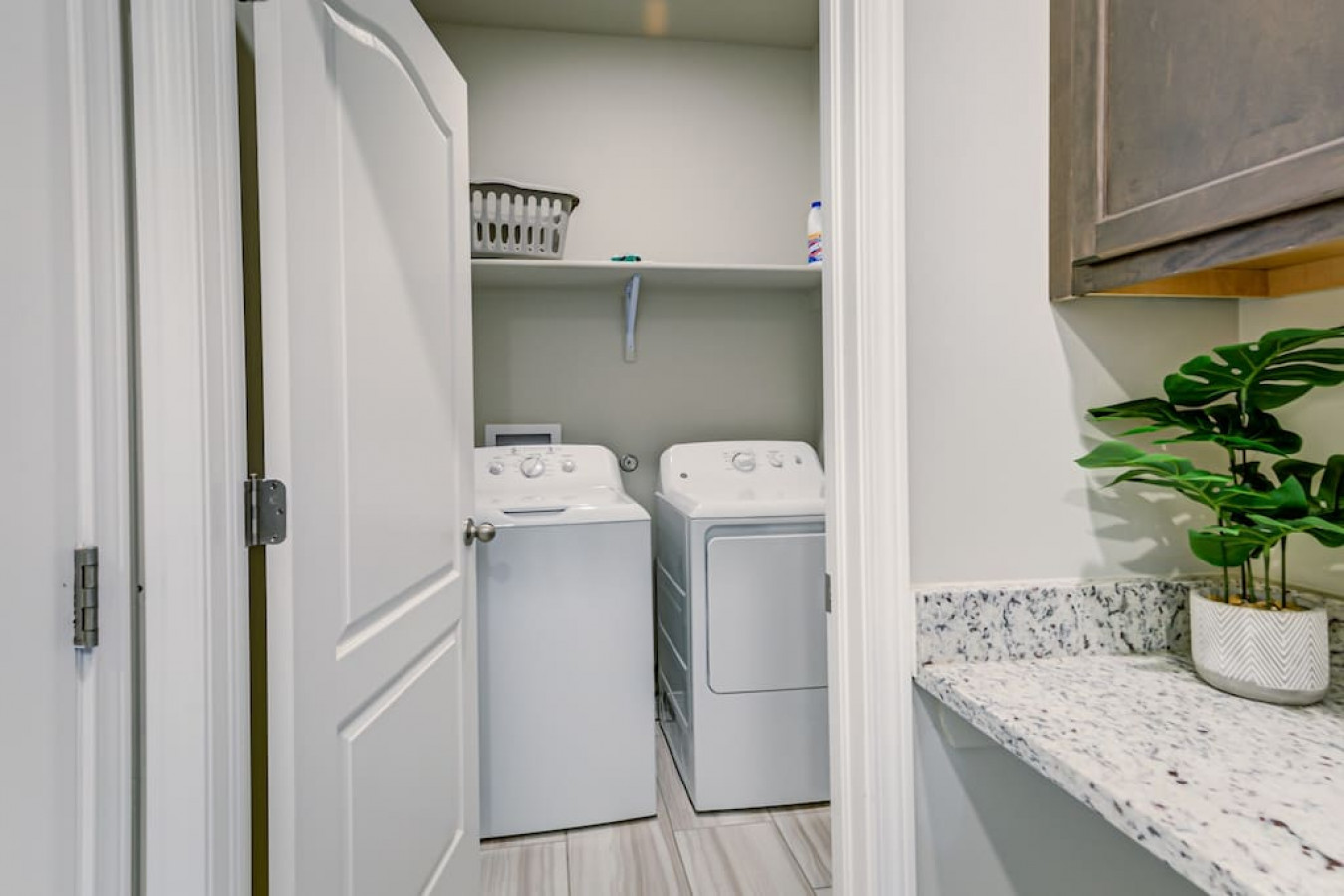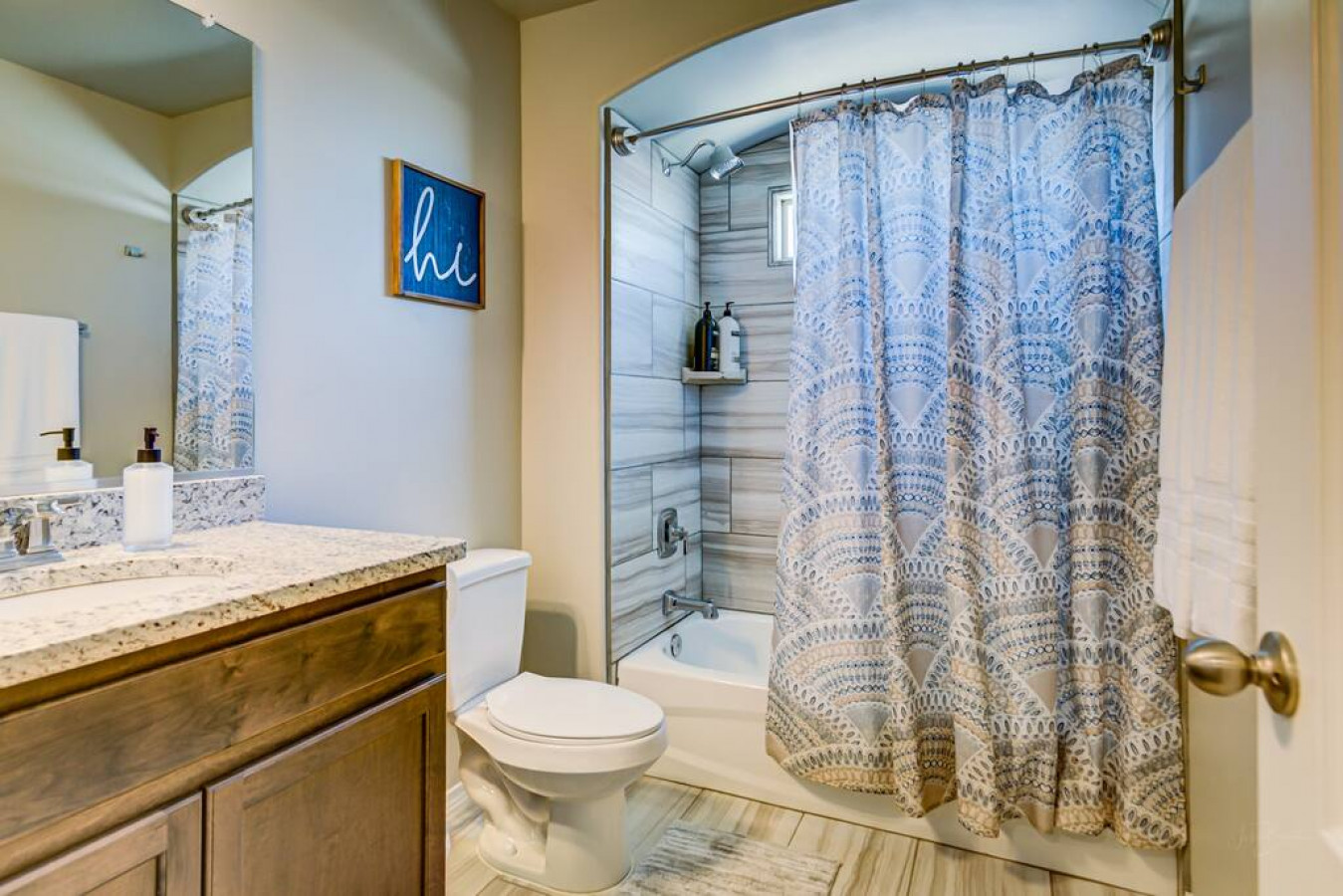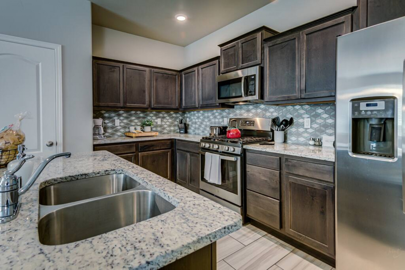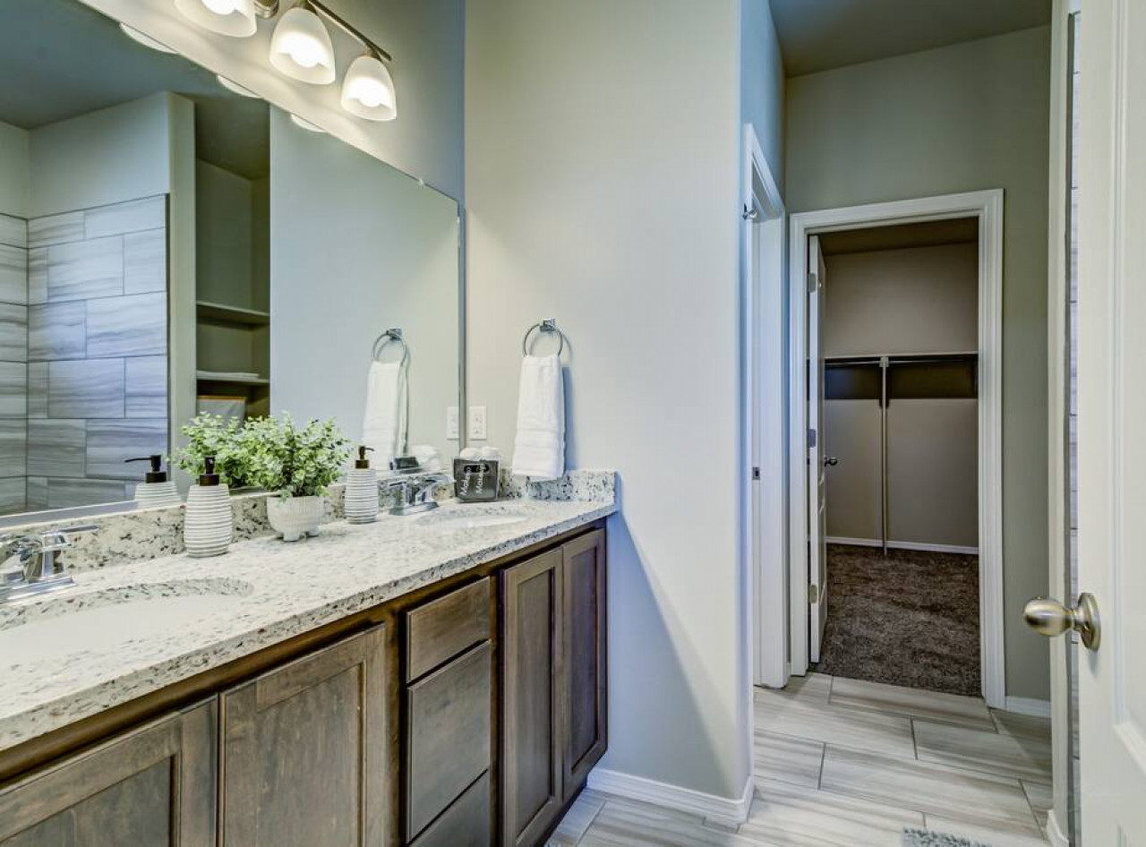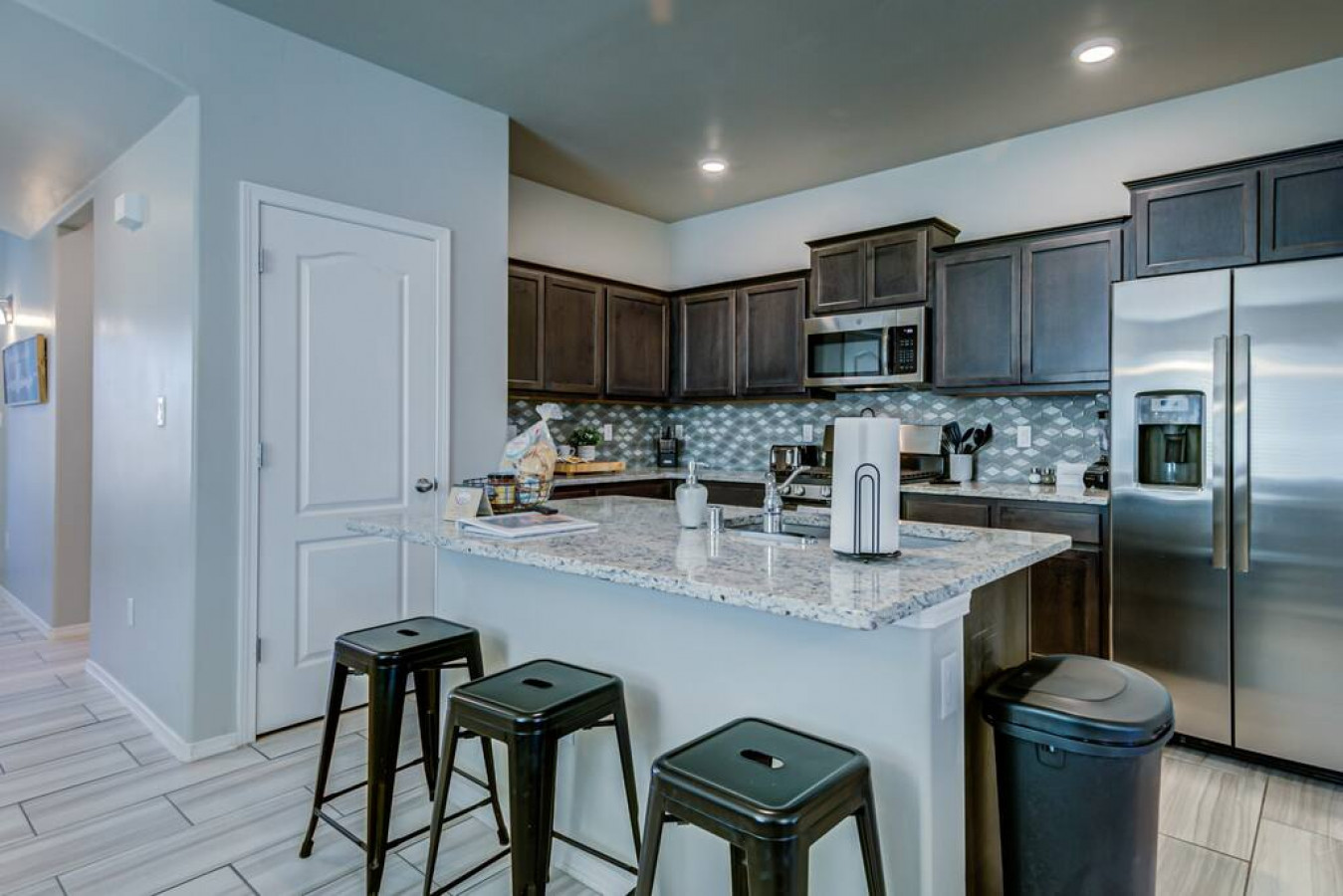 * Granite counters, soaking tub, wood-look tile floors.