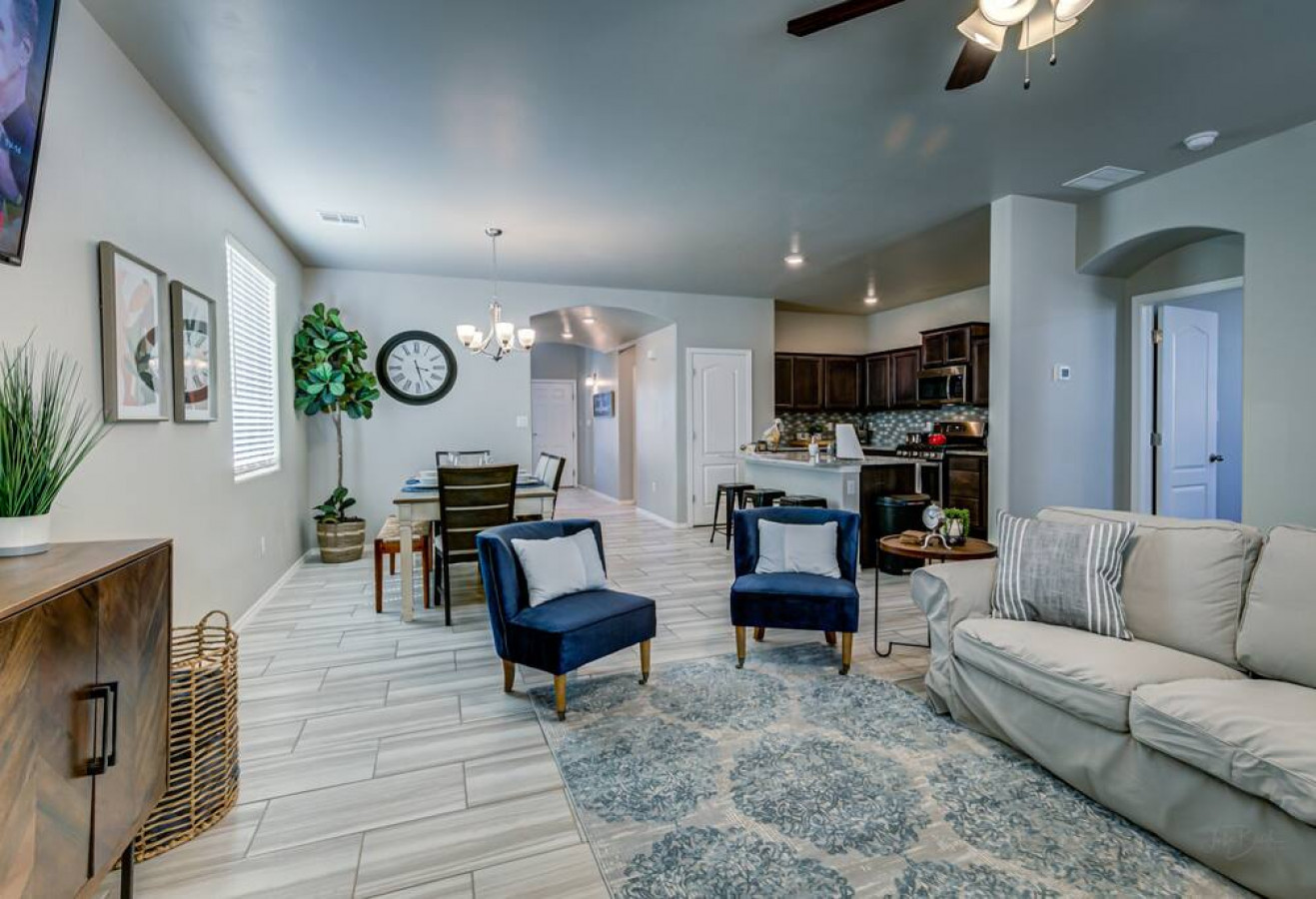 * Beautiful new home in a desirable & safe part of Las Cruces. It has 3.5 baths and 4 bedrooms, including 2 master suites, with comfortable memory foam beds, including a king, 2 queens, a double twin bunk bed with a full on top. Includes grill area, outdoor furniture, and brand new furniture and appliances.